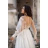 Корсажное свадебное платье. Лиф со спущенным плечом, выложен кружевом с бисером и пайетками. Спинка на застежке пуговицы до верха. Рукава длинные, по низу сборка, на кружевном манжете с пуговками. Юбка молоко фатиновая, верхний слой юбки выложен кружевом. Талия декорирована кружевом.